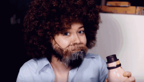 Twitch streamer Meadow Fox cosplays as Bob Ross, complete with afro wig and beard, giving a cheerful thumbs up.