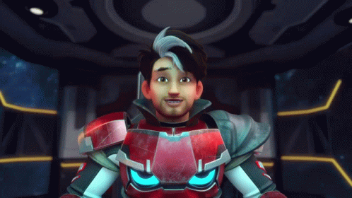 Amato, the main character from Mechamato, wearing his red and silver suit with Mechabot in a futuristic setting.