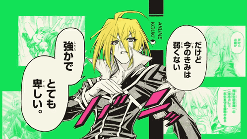 Kouki Akune from Medaka Box featured in a dynamic manga panel with Japanese text and character quotes.