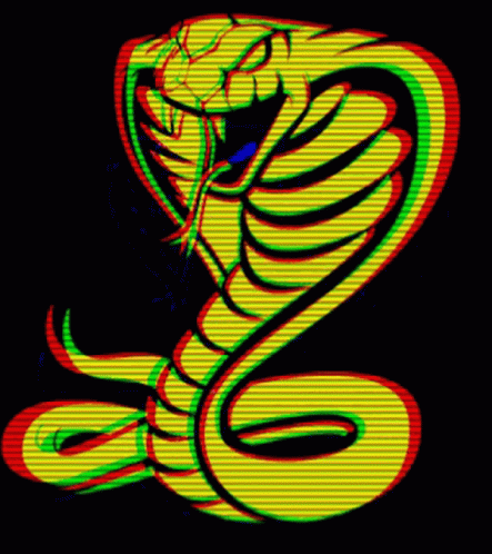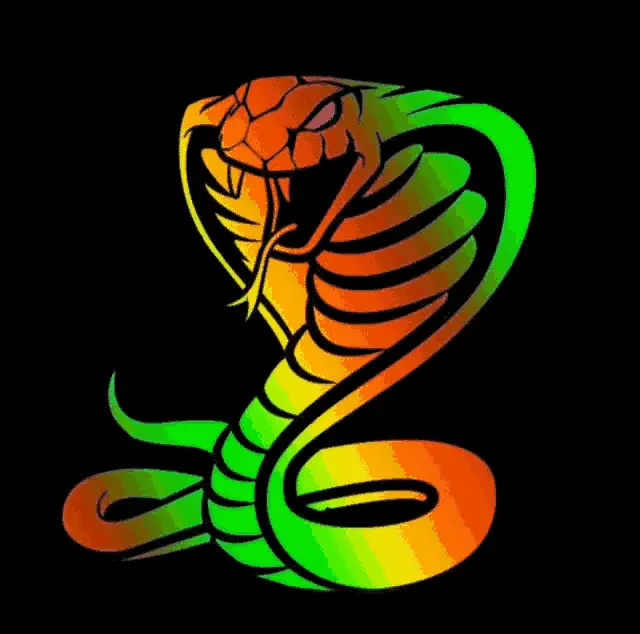 A vibrant yellow stylized cobra with blue eyes, coiled against a black background, representing Medinsana Cde.