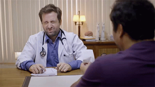 Gregorio Duvivier as a doctor making a disgusted face while talking to a patient in a consultation room.