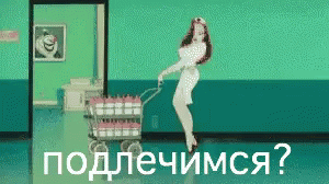 Jessica Rabbit as a playful nurse pushing a cart full of bottles, asking 'Shall we get treated?'