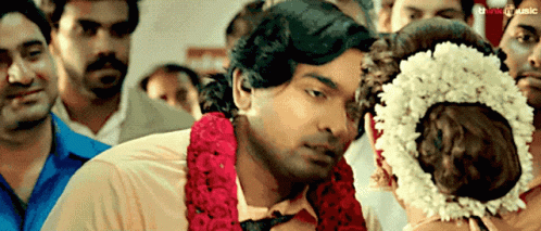 Meerakannan, adorned with a red garland, shares a tender moment with Anjali, who wears a white floral garland, at their wedding.