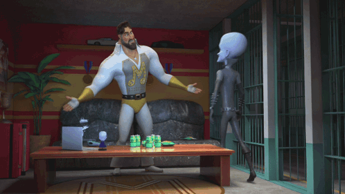 Megamind and Metro Man share a warm hug in this animated scene, with medals visible on the wall.