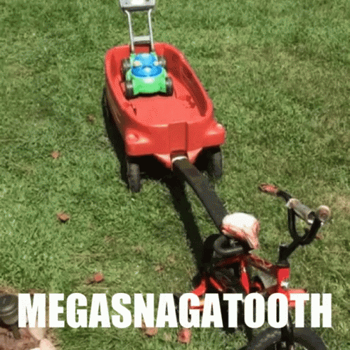 A creative DIY setup featuring a red wagon, toy lawnmower, and bicycle, labeled Megasnagatooth.