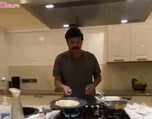 Megastar Chiranjeevi skillfully flips roti in his kitchen, showcasing his cooking talent.