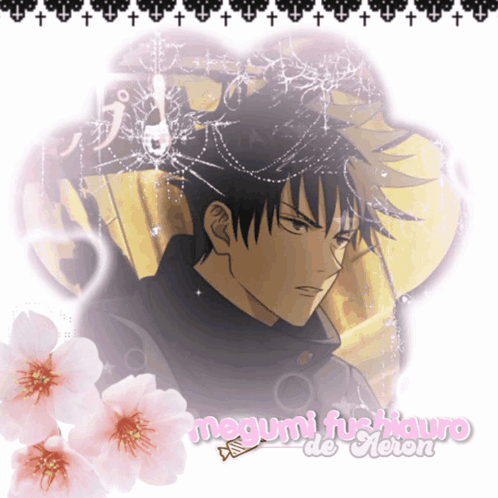 An aesthetic fan art image of Megumi Fushiguro from Jujutsu Kaisen, featuring cherry blossoms and a soft filter.