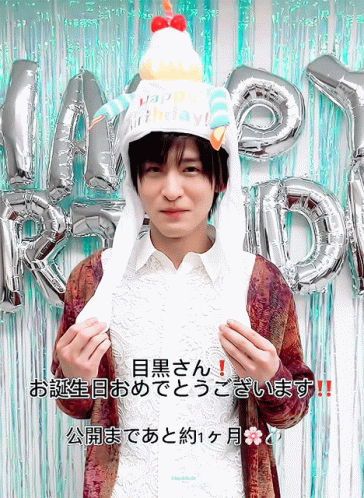 Meguro Ren from Snow Man celebrates his birthday wearing a fun cake hat, with 'HAPPY BIRTHDAY' balloons in the background.