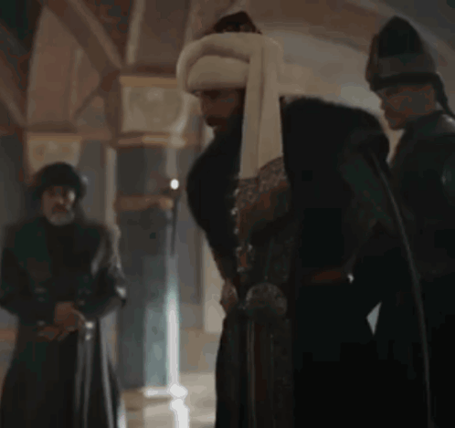 a man wearing a turban is standing in a room with other men