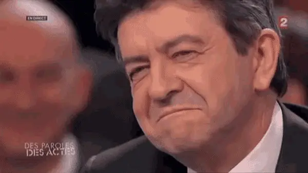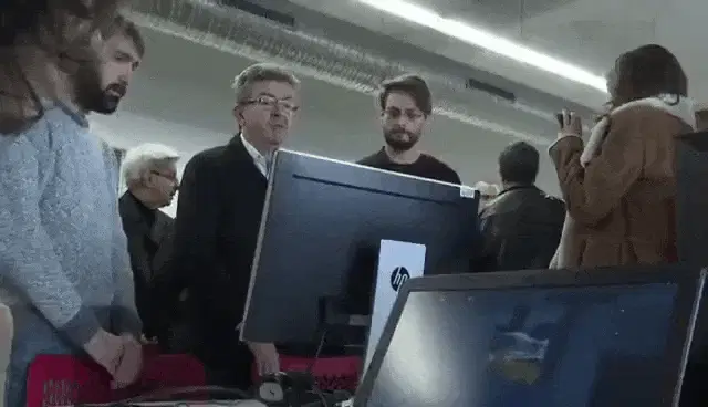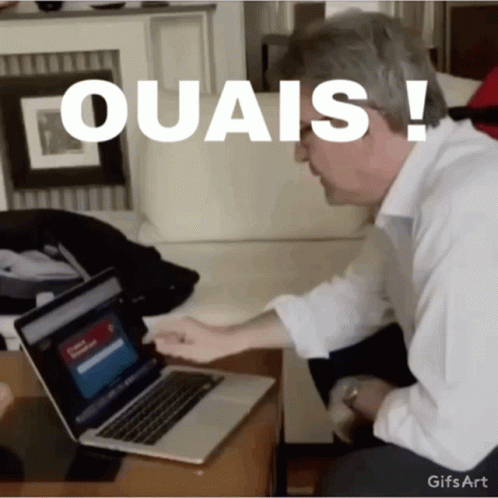French politician Jean-Luc Mélenchon reacts with an emphatic "OUAIS!" while sitting in front of a laptop.