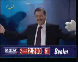 Melih Gökçek, a Turkish politician, stands between two cat mascots on a TV show set, gesturing with outstretched arms.
