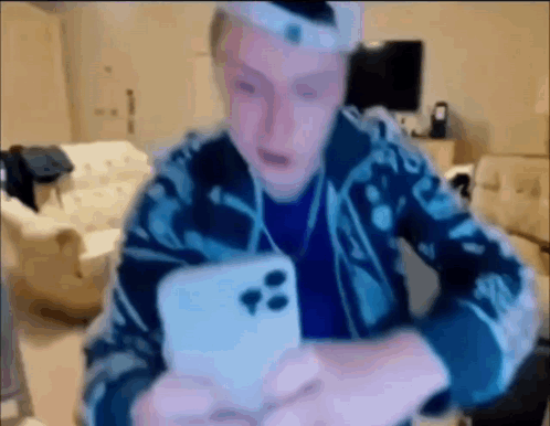 Mellstroy, wearing a cap and patterned jacket, reacts intensely while holding a white smartphone.