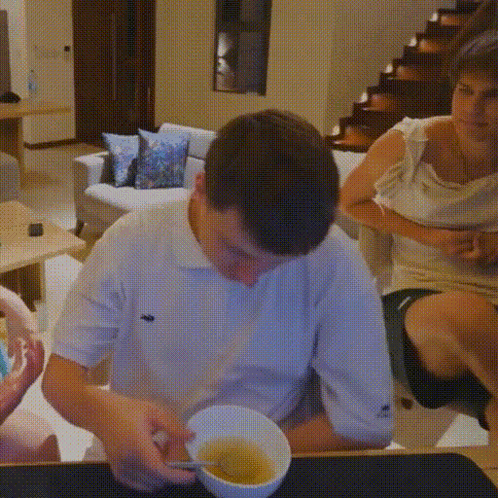 Mellstroy is seen eating from a bowl, then suddenly looks up with a shocked and wide-eyed expression.