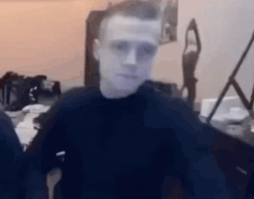 Mellstroy, a man in a black sweater, performs an energetic hand movement in front of a mirror.