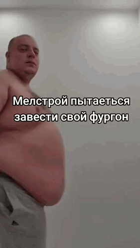 Mellstroy, shirtless, attempts to 'start his van' by jiggling his large belly in a humorous way.