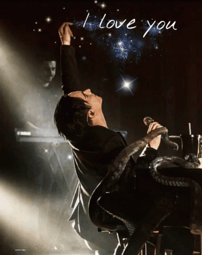 Melovin performs live, singing into a microphone with 'I love you' displayed, captivating his Melovinators.