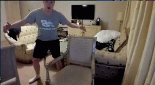 Мелстрой reacts with wide eyes and an open mouth, holding onto a chair in a living room.