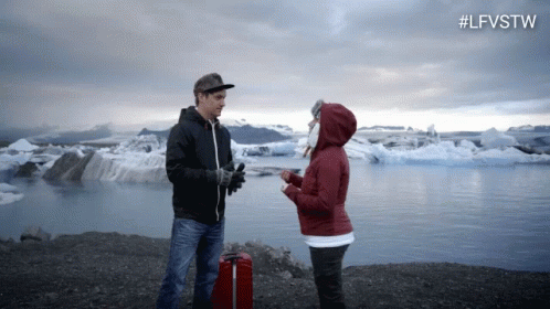 A man and a woman stand by a melting glacier lake with a red suitcase, under a cloudy sky. #LFVSTW