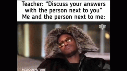 A meme showing two men in a studio, illustrating the 'discuss your answers' school scenario.