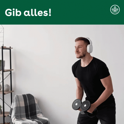 A man wearing headphones works out with dumbbells, motivated by the prominent German phrase 'Gib alles!' (Give everything!).