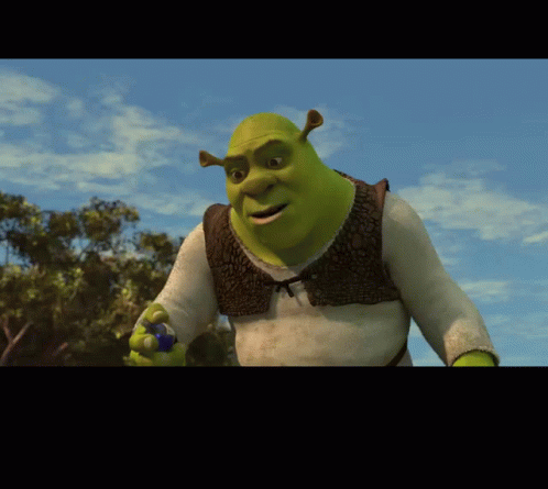 Shrek holds a blue ball, pondering if it works on donkeys, a popular meme from DreamWorks' animated movie.