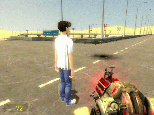 A character in Garry's Mod gives a thumbs-up before comically ragdolling on a desert road.