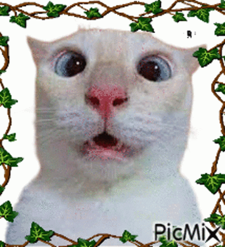 A funny meme featuring a white cat with wide eyes and an open mouth, looking surprised, framed by green ivy.