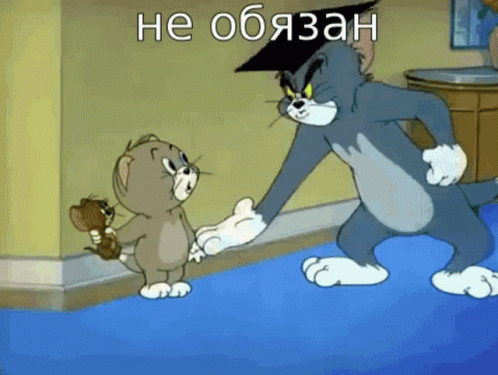 Tom and Jerry meme featuring the Russian caption 'не обязан' (not obliged), with Tom looking sternly at Jerry.