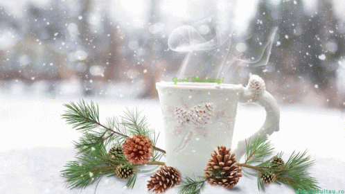 A cozy winter morning scene with a steaming coffee mug, pine branches, and a 'Good Morning!' message.