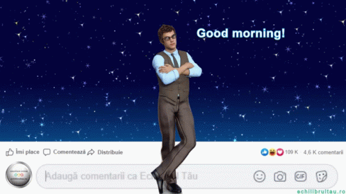 An animated man wishes 'Good morning!' and suggests 'Coffee time!' against a beautiful starry sky.