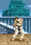 Ryu from Street Fighter celebrates a victory with 'Menang!!' (Win!!) displayed on screen.