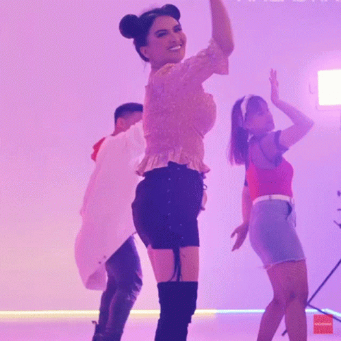 Dianna Dee Starlight dancing energetically in a pink top and black shorts with two other dancers.