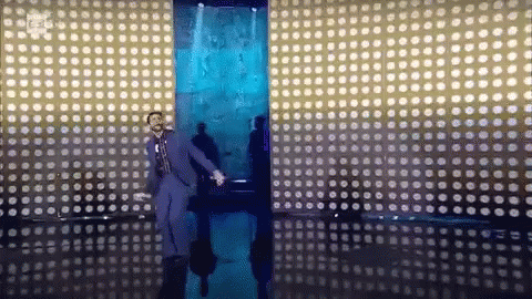 Marco Mengoni performs on stage, raising his arms to the applause of the audience.