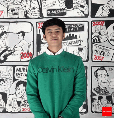 Denias, wearing a green Calvin Klein sweater, yawns widely in front of a wall covered with comic strip art.