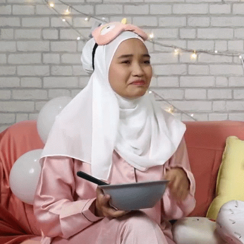 Nabila, wearing a hijab and pajamas, sits on a couch, crying and wiping away tears while holding a bowl of food.