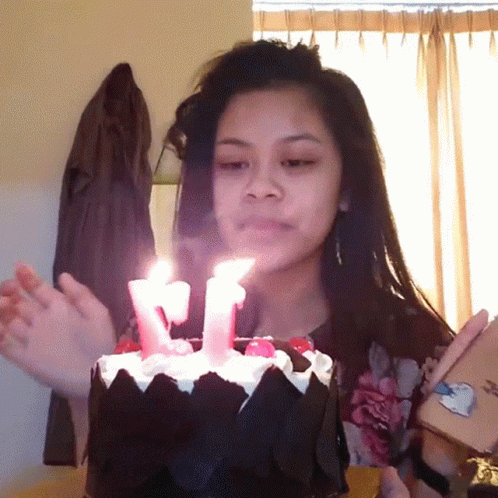 Meli celebrates her birthday by blowing out the candles on her cake, which form the number 21.