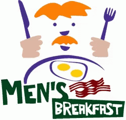 A colorful logo for 'Men's Breakfast' featuring a man, eggs, and bacon with the text 'Let's Eat'.