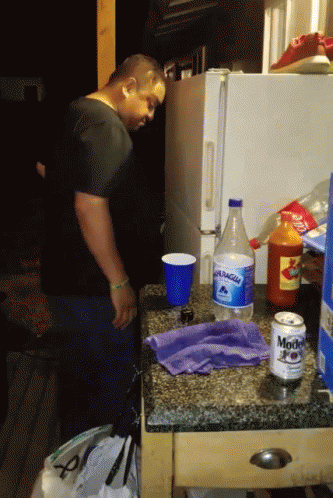 A man stands by a counter with a Modelo beer can and other items, possibly reacting to a 'mentada'.