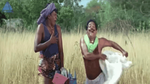 Vadivelu and Singamuthu in a hilarious comedic scene, running through a field with a white cloth.
