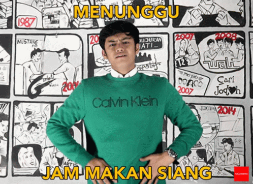 A man in a green Calvin Klein sweater is visibly hungry, holding his stomach and waiting for lunch time.