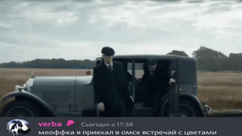 Meoffka and Verba chat about arriving in Omsk, featuring men in suits getting out of a car.