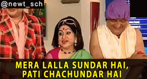 Manju Sharma delivers a humorous line, "My son is beautiful, my husband is a shrew," in a comedic scene.
