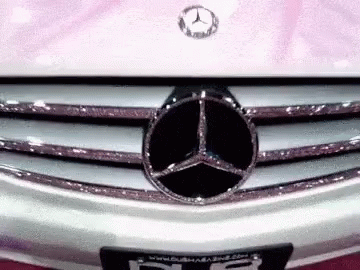 Close-up of a white Mercedes Benz car featuring a custom pink hood design and a rhinestone-studded grille.