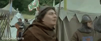 Jacquouille in a brown robe exclaims 'Thank God!' in a medieval camp setting.