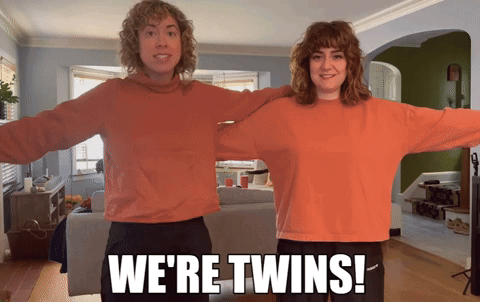 Meredith Stepien and Ali Gordon pose side-by-side, humorously declaring 'We're Twins!' in matching outfits.