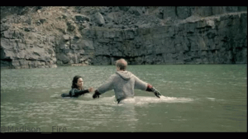 Arthur Pendragon and Guinevere (Gwen) from Merlin BBC share a tender hug while submerged in a quarry lake.