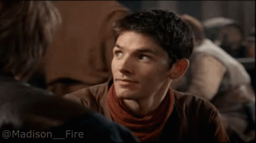 Merlin (Colin Morgan) smiles and says 'Thank you' in a medieval setting.