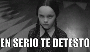 Merlina Addams looks sternly at the camera with the caption 'I seriously hate you' overlaid.
