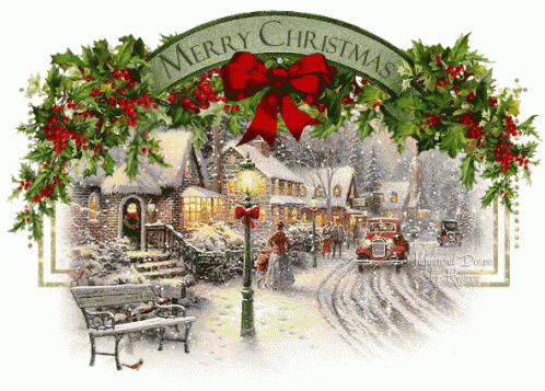 A beautiful illustration of a snowy Christmas village with a 'Merry Christmas' banner and festive holly.