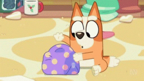 Bluey celebrates Merry Christmas Eve, sitting on the carpet with a purple bag, ready for holiday fun.